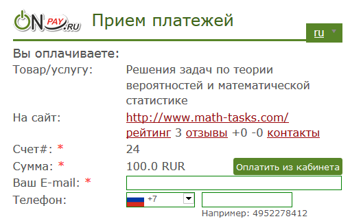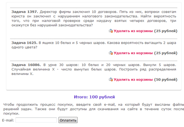 Перейдите в корзину, внизу под списком задач введите свой электронный адрес (на него будут высланы файлы решений, будьте внимательны) и нажимайте на кнопку Оплатить. Дальнейшие действия описаны ниже в разделе Выбор способа оплаты и осуществление платежа.