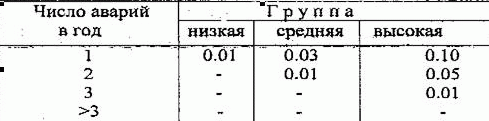 Задача 4477. По частоте попадания в ДТП водители делятся на 3 группы: низкая (25% водителей), средняя (60%), высокая (15%). В таблице показана вероятность различного числа аварий для водителей разных групп. Какова вероятность принадлежности водителя к разным группам, если он не попадал в аварию в течение: 1) 1 года, 2) 4 лет?